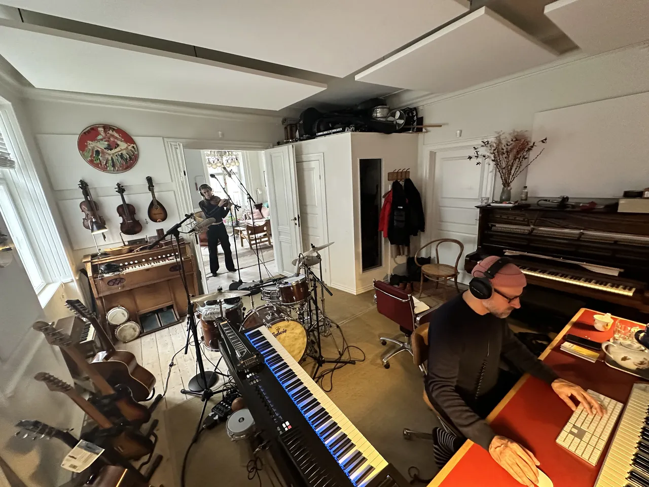 It’s rather cloudy in Copenhagen and we spent the day recording strings, trying to blend the acoustic sound of the muted studio and the more hall like living room, using Cole to not overdo the high frequencies and Neumann tactile details, placing them right in the door between the two very different sonic rooms.